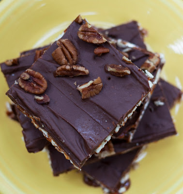 Heat oven to 400. Line a cookie sheet (with at least a 1/2 inch rim) with parchment paper. In this order: line TCHO drops in a single layer, then saltine crackers in a single layer, then pour cajeta over saltines and spread to cover crackers completely. Bake for about 5 minutes, until bubbly (keep an eye on it to make sure it doesn't boil over, because that makes a terrible mess). Remove from oven and layer TCHO drops over the top and let sit a couple of minutes to melt, then spread it evenly, top with Texas pecans. Chill in the fridge for at least one hour before cutting and serving.